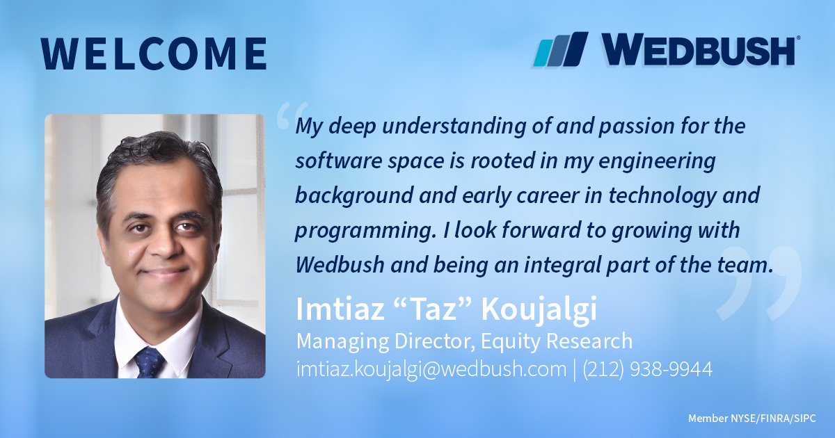 Kevin Merritt, Wedbush Securities’ Director of Research adds, “We’re thrilled to welcome Taz to our team and look forward to the impact he will have on our expanded software coverage. Taz’s strong background will serve to further accelerate our growth in the technology space.”